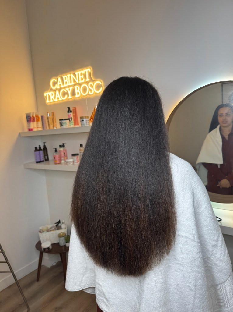 « Franchement, je repoussais tout le temps l’idée de couper mes pointes par peur de perdre de la longueur. Mais là je suis tellement soulagée ! Tracy a su me mettre à l’aise, elle m’a bien expliqué pourquoi c’était nécessaire, et elle a coupé juste ce qu’il fallait, pas plus. Mes cheveux sont plus doux. Je reviendrai sans hésiter »